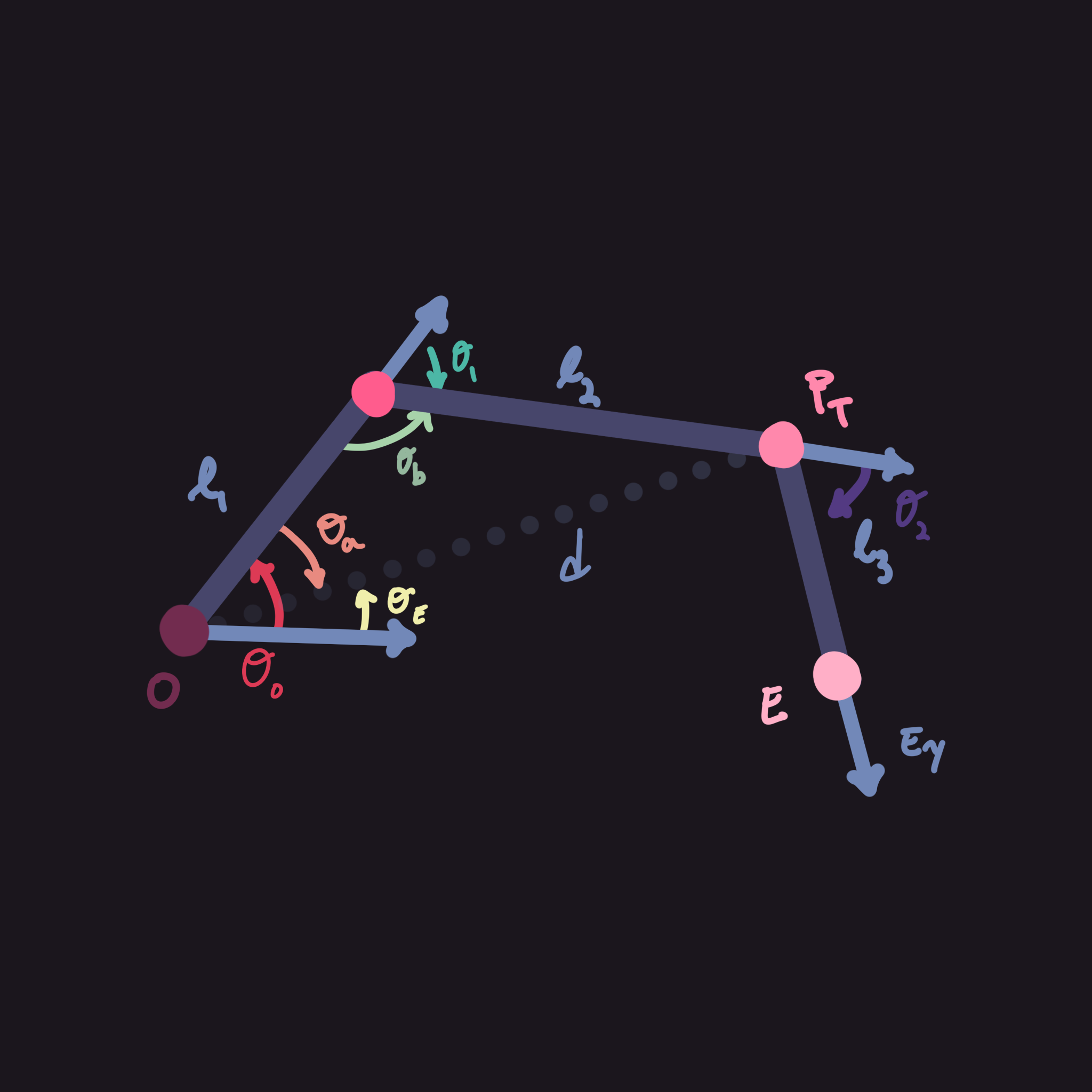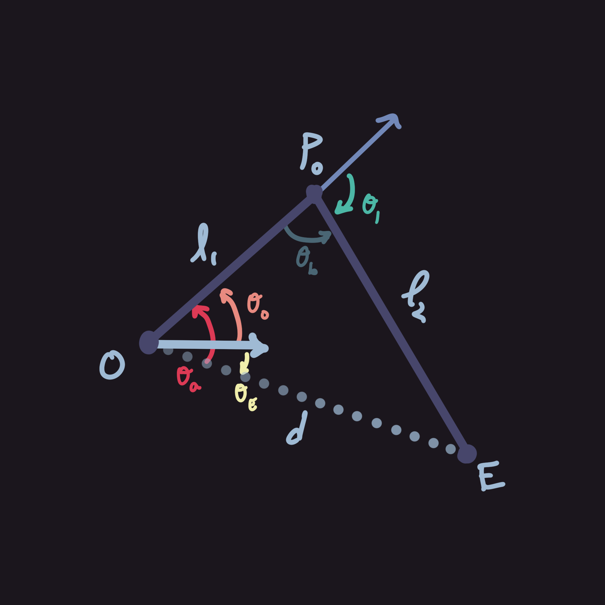 - $\theta_E$ - the angle from the origin to the end effector (be careful when calculating this and make sure to use $\text{atan2}(y,x)$ instead of the normal trig functions or else the signs are going to act weird)