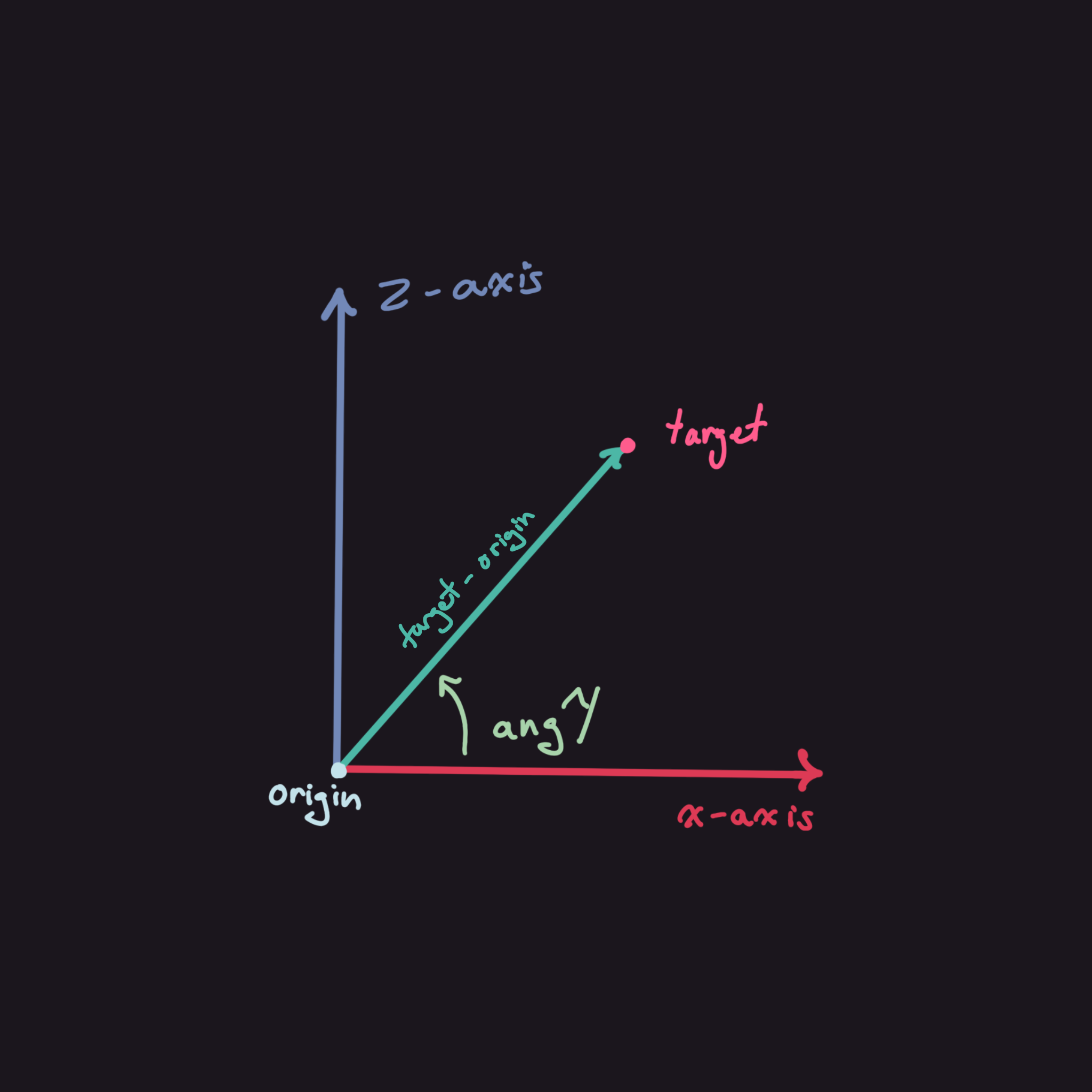 Anyways, this diagram should show the relationship between the two planes we want to construct. The plane constructed with the vector target - origin is expected to be able to freely rotate around the y-axis. This diagram doesn't show height well since its 2D but target - origin should be flattened onto the xz-plane to construct the plane although it doesn't matter to much if you define the plane using the cross product of target - origin and the y-axis.